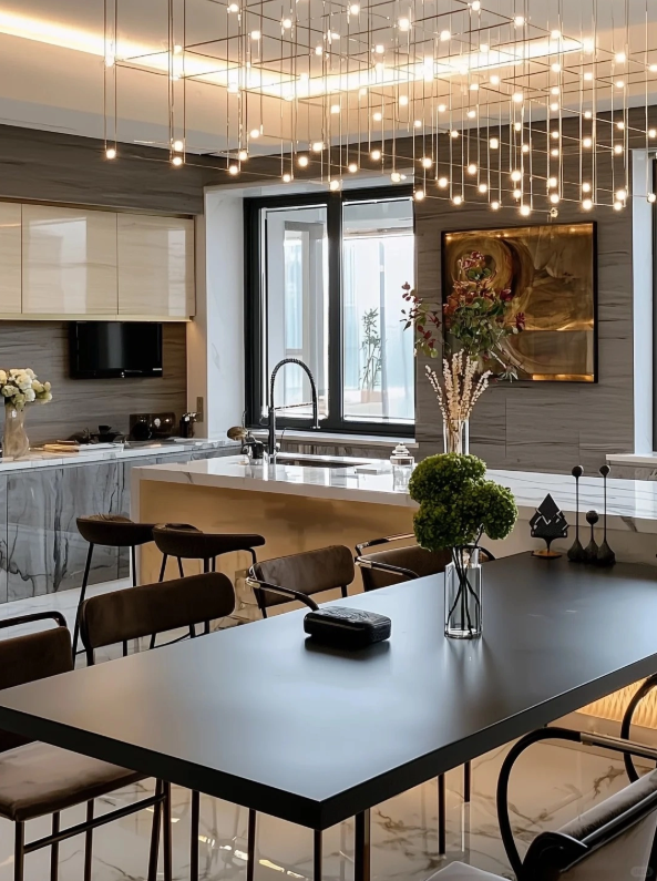 In larger kitchens, mixing dark floors with dark cabinets can add a sense of richness and coziness. To avoid the space feeling too heavy, incorporate lighter elements such as white countertops or stainless steel appliances to create a more balanced aesthetic.